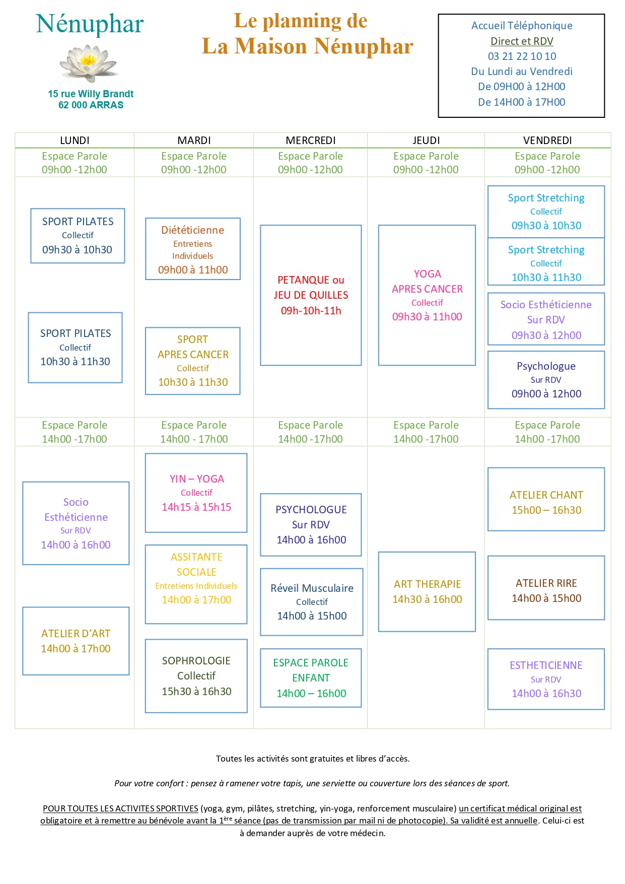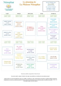 Planning des activités Découvrez le planning annuel de la Maison Nénuphar Pour être encore plus à votre écoute, la Maison Nénuphar multiplie ses Bulles d’Accueil .ce document est aussi à votre disposition à la Maison Nénuphar.Télécharger le planning